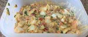 - Meng alles door elkaar met een flinke lepel mayonaise en sweet chilisaus.