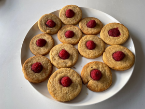 3. De frambozen in de koekjes doen is ook een leuke klus! Laat in dat geval de fantasie in de vrije loop. Als ze 2-3 frambozen op het koekje doen helemaal prima!